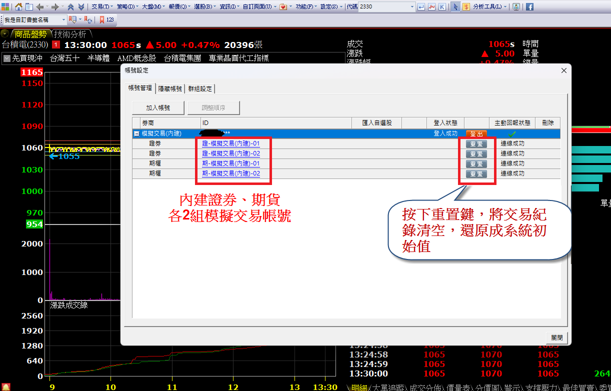 • 提供重置(reset)功能,帳號在交易過後,如果想要試試不同的策略、標的,則按下重置,系統會清除帳戶交易紀錄,還原成系統初始值,目的是在於讓各位使用者,能夠測試不同策略。