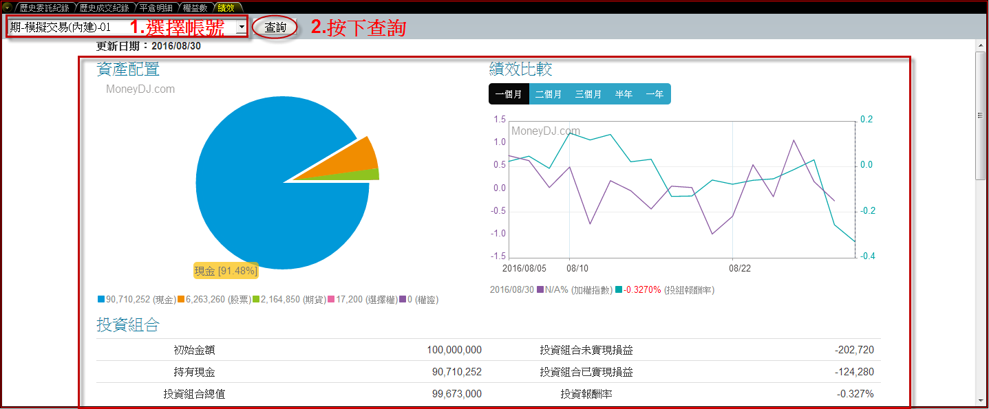 選擇欲查詢的帳號,按下查詢,會提供每日收盤後的績效結算資訊。 選擇欲查詢的帳號,按下查詢,會提供每日收盤後的績效結算資訊。