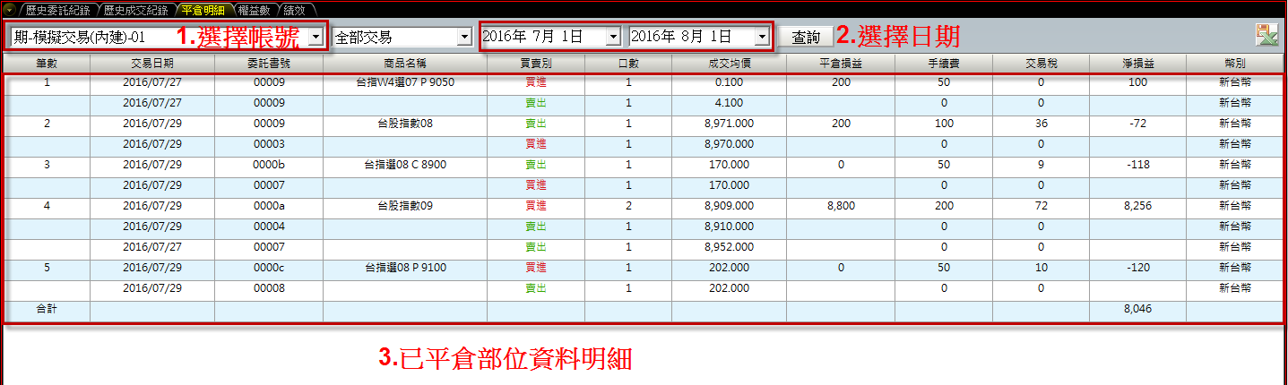 選擇欲查詢的帳號,再設定完查詢區間後,按下查詢,就會出現查詢區間內已平倉部位的資訊。 選擇欲查詢的帳號,再設定完查詢區間後,按下查詢,就會出現查詢區間內已平倉部位的資訊。