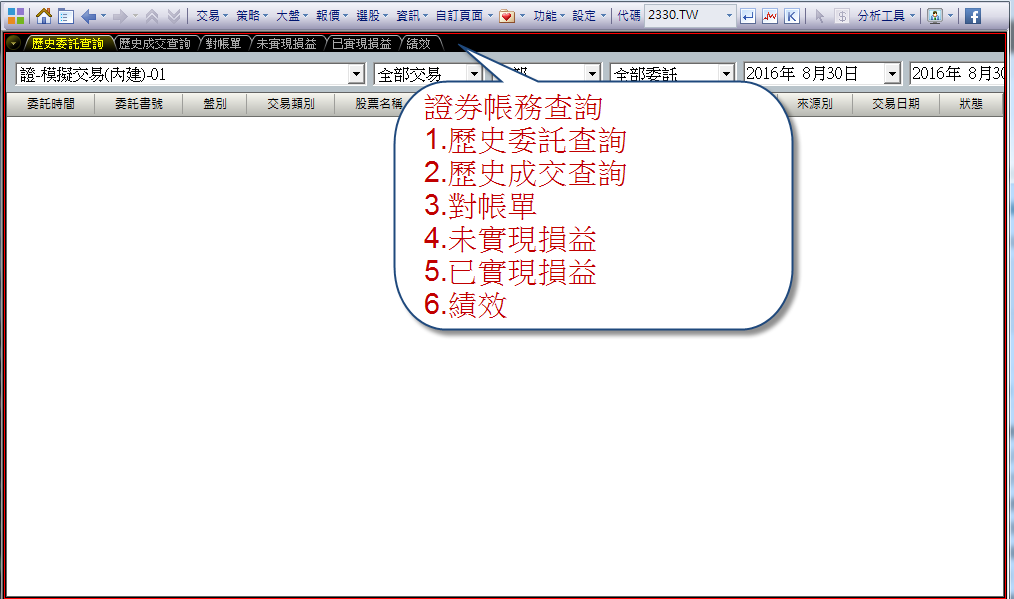 點選交易目錄底下證券帳務,進入證券帳務頁面。 ▼ 點選交易目錄中的期權帳務,進入證券帳務頁面 點選交易目錄中的期權帳務,進入證券帳務頁面  ▼ 證券帳務資訊分為歷史委託查詢、歷史成交查詢、對帳單、未實現損益、已實現損益、績效等六項頁面,點選不同的頁面,會有不同的資訊 證券帳務資訊分為歷史委託查詢、歷史成交查詢、對帳單、未實現損益、已實現損益、績效等六項頁面,點選不同的頁面,會有不同的資訊