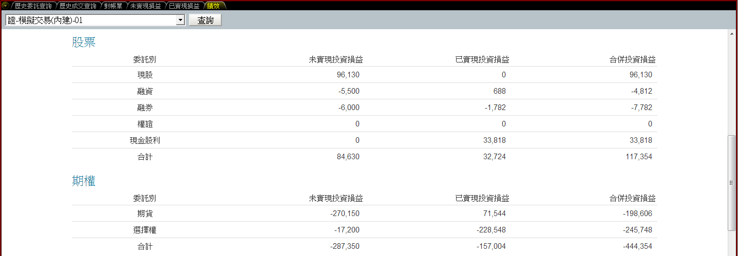• 此部分證-模擬交易(內建)-01、期-模擬交易(內建)-01為投資組合帳戶,故績效頁面資訊相同,內建-02為同樣概念呈現。