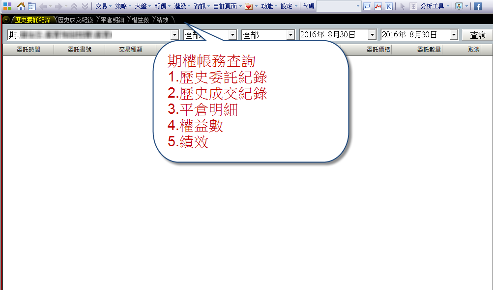 點選交易目錄中的期權帳務,進入期權帳務頁面。 ▼ 點選交易目錄中的期權帳務,進入期權帳務頁面 點選交易目錄中的期權帳務,進入期權帳務頁面  ▼ 期權帳務資訊分為歷史委託查詢、歷史成交查詢、平倉明細、權益數、績效等頁面,點選不同頁面,會有不同的資訊 期權帳務資訊分為歷史委託查詢、歷史成交查詢、平倉明細、權益數、績效等頁面,點選不同頁面,會有不同的資訊