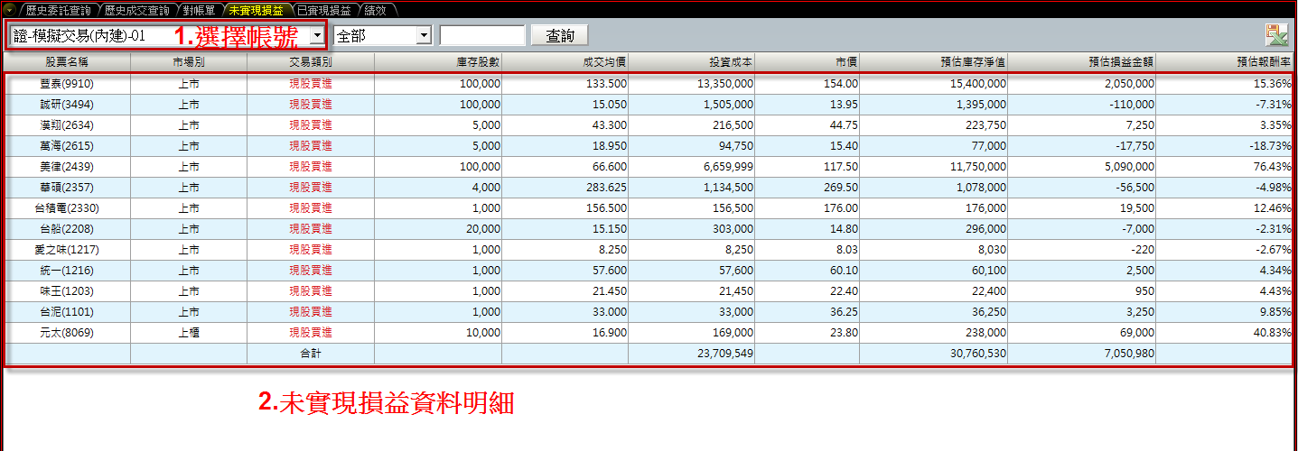 未實現損益:選擇欲查詢的證券帳號,按下查詢,會有未出場之股票預估損益計算。 未實現損益:選擇欲查詢的證券帳號,按下查詢,會有未出場之股票預估損益計算。
