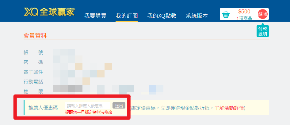 - 官方優惠碼折抵:首次訂閱時,輸入官方優惠碼@XQ8899,可享首月現抵100元的優惠。您可以在「我的訂閱」當中,找到「推薦人優惠碼」進行綁定即可。