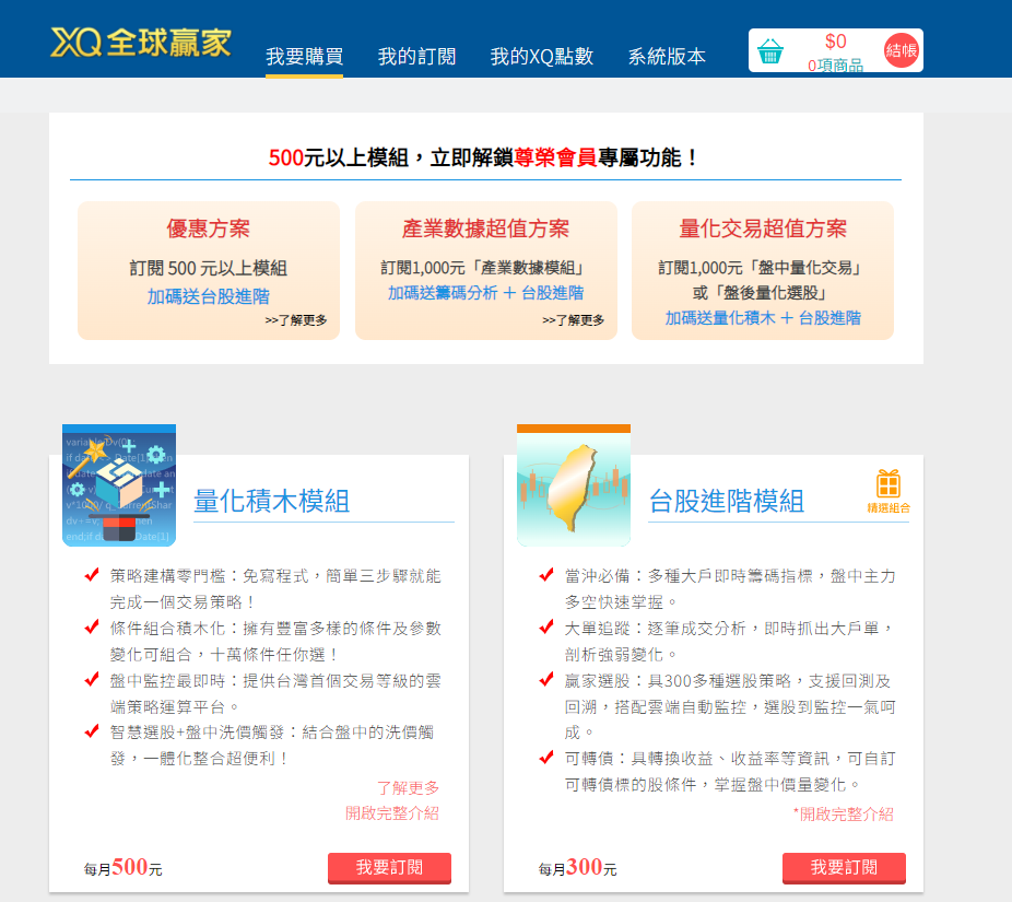 - 量化交易超值方案:訂閱月費1,000元的「盤中量化交易模組」或「盤後量化選股模組」,即贈送量化積木模組和台股進階模組,助您打造專屬交易策略。