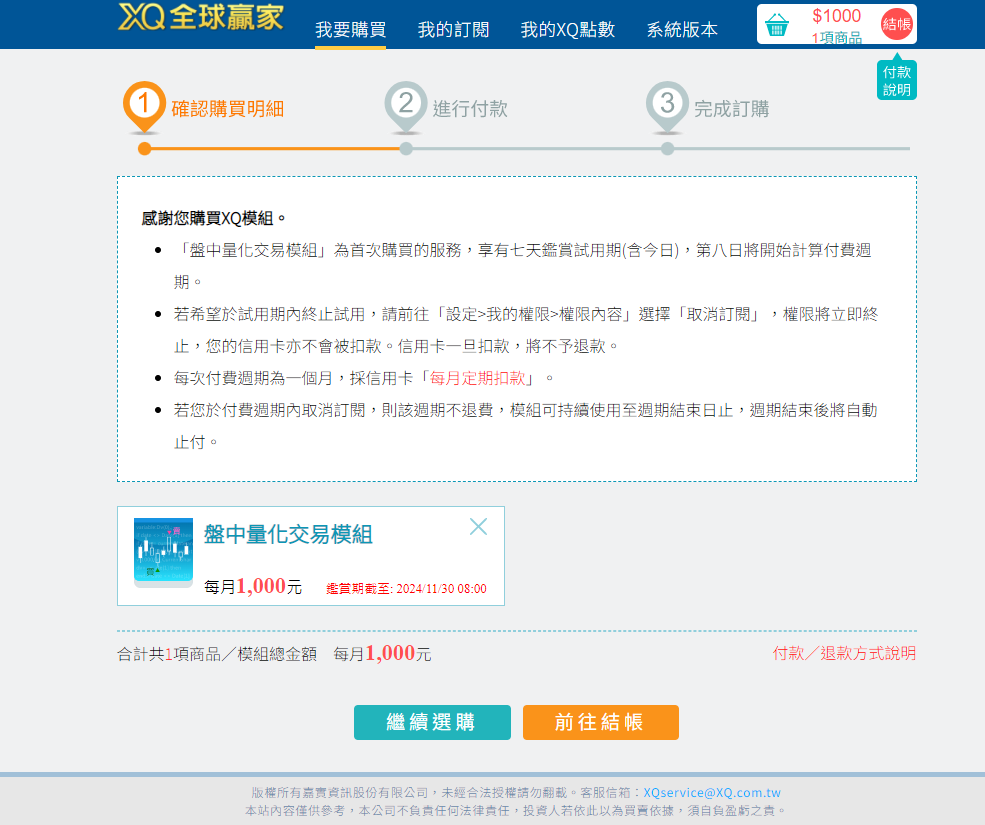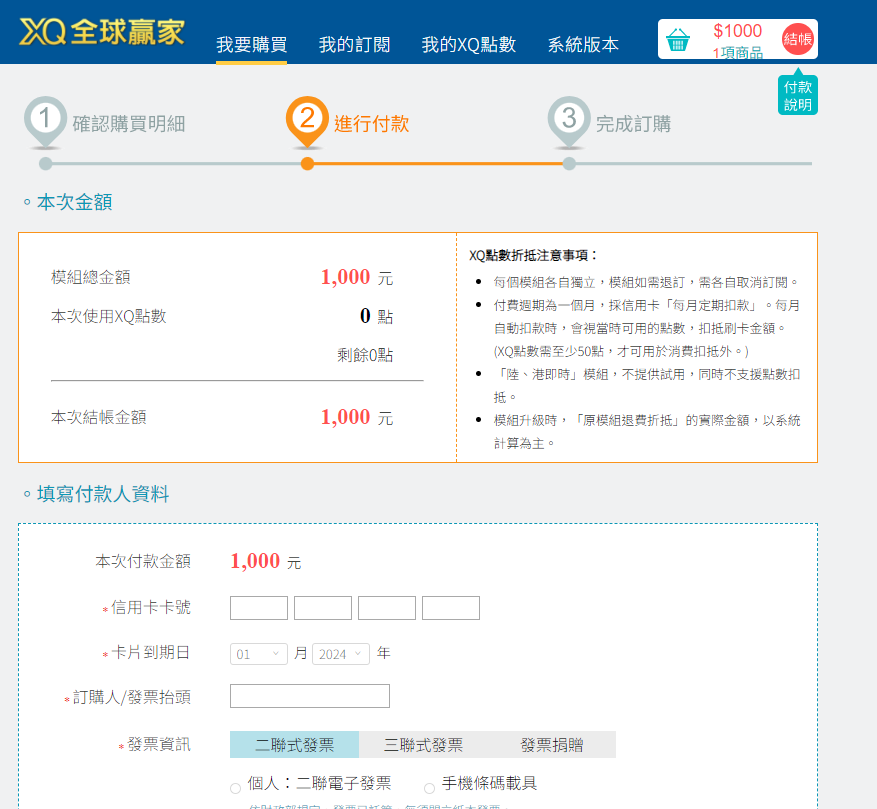 接著您就可以完成您的購買了,在這邊您也可以使用綁定優惠碼或是其他優惠方案的 XQ 點數進行折抵,讓您更聰明的消費。 另外,您在使用 XQ 點數的時候,也請留意以下 XQ 點數折抵注意事項:- 模組獨立性:每個模組皆為獨立運作,若需退訂,請分別取消各自的訂閱。