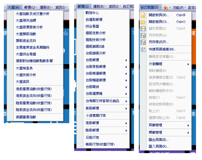工具列類似大家常用的瀏覽器,讓大家使用 XQ 豐富的功能時,能夠快速切換與穿梭在多個頁面中,「頁面瀏覽功能」提供了像是:快捷頁、首頁、上下頁、選擇上下商品、我的最愛資料夾、書籤工具列管理。 XQ 也提供各種自訂頁面的功能,想要進一步了解可以參考 《 功能介紹:如何管理 XQ 自訂頁面? 》。