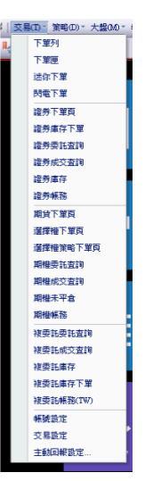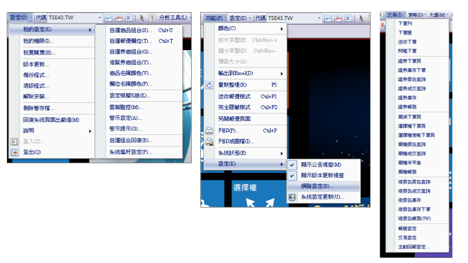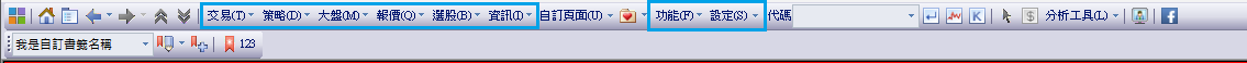 XQ 所有的豐富功能,都在「交易」、「策略」、「大盤」、「報價」、「選股」、「功能」、「設定」這些選單底下,關於這些功能項目的詳細說明,請看後面的【2. XQ 電腦版功能概覽】