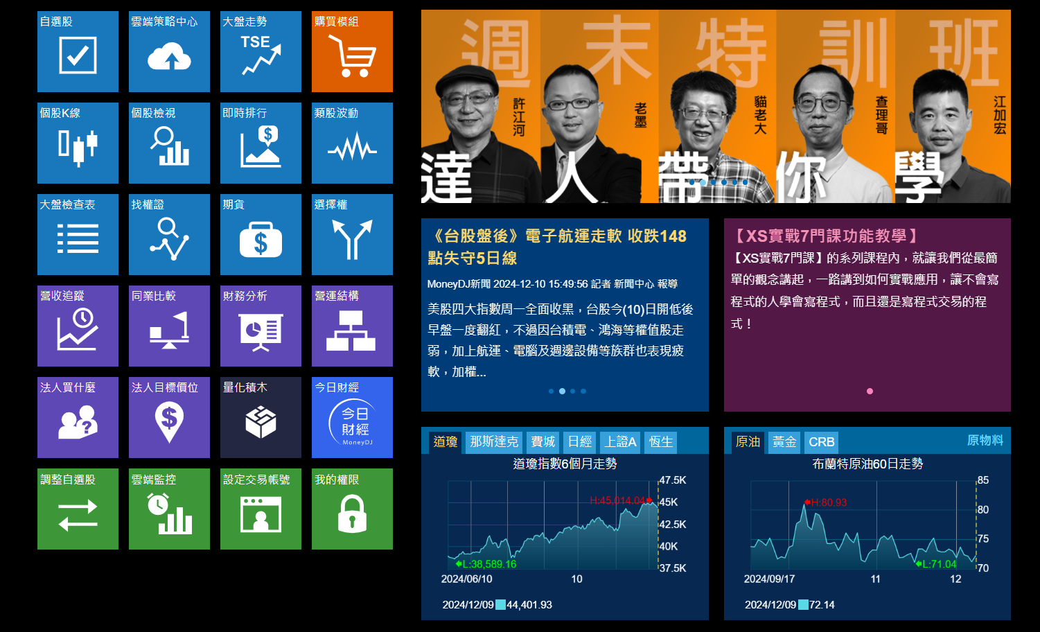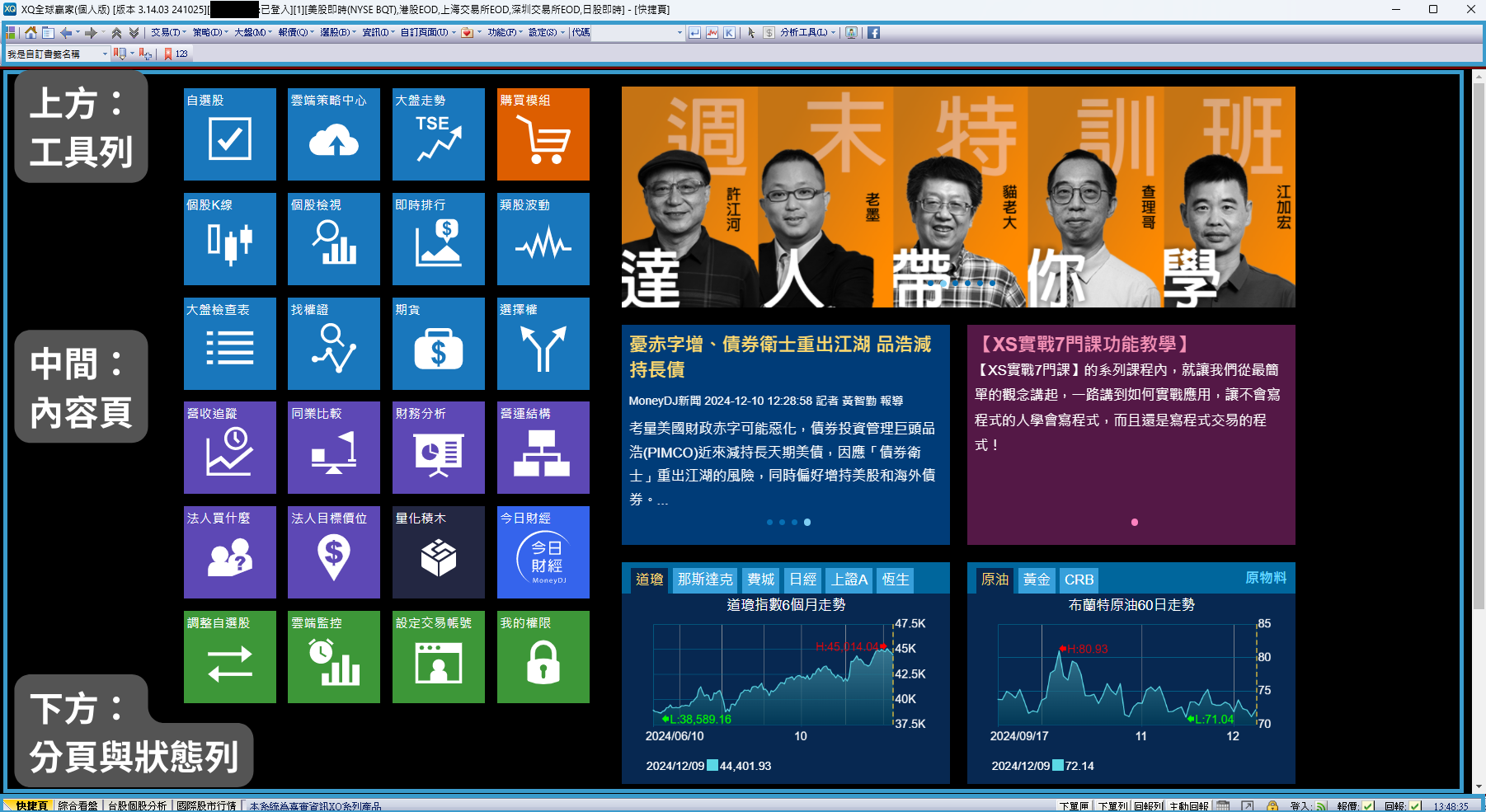對於已經有主觀交易經驗,但對量化交易還不熟悉的投資者來說,XQ 全球贏家是一個理想的入門選擇。 這款由台灣自主研發的量化交易平台,將繁瑣的交易流程簡化,並提供豐富的工具來協助交易策略的實現。不管是選股、回測、還是自動化執行,XQ 都能滿足您從盤前到盤後的所有需求。 接下來,我們將為你介紹 XQ 的介面功能說明,幫助您快速上手,進入量化交易的世界。如果你對某個功能感興趣,可以點擊文中的連結深入了解喔!1. XQ 電腦版介面架構