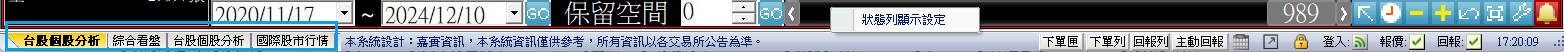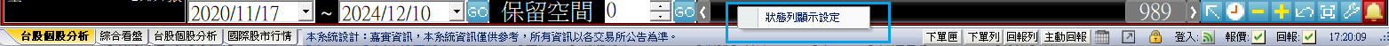 狀態列顯示使用者的「登入」、「報價」、「回報」、「證交所」的系統連線資訊。也可以點擊「下單匣」、「下單列」、「回報列」、「主動回報」來查看交易相關資訊。 想要設定狀態列,可以在上面點擊”右鍵”進行設定。 ▼ XQ畫面下方的狀態列示意圖