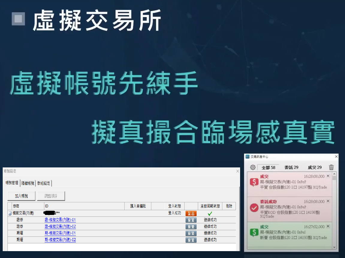 XQ的「內建模擬交易帳號」功能,為投資者打造真實報價的模擬交易環境,支援證券與期貨各兩組模擬交易帳號。 系統提供初始資金5,000萬元(證券與期貨各5,000萬),不論是投資新手還是交易老手,都能輕鬆利用模擬帳號快速測試投資策略,驗證操作成果,並有效降低實際投資風險。無需擔心市場波動,模擬交易讓你更安心地提升交易技巧! 想了解 XQ 的程式自動下單相關功能,可以參考以下相關文章: 2.2.5. 下單