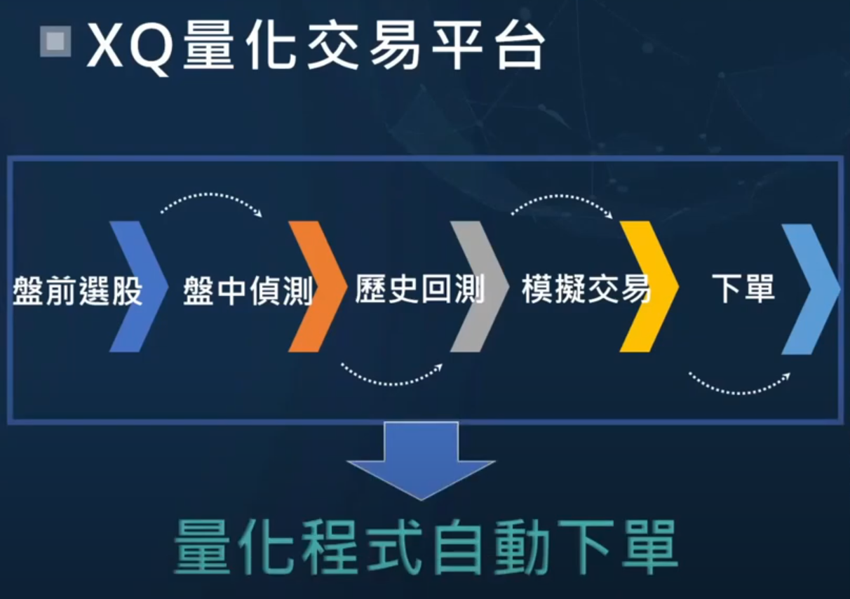 XQ 能夠協助投資人所有的交易循環,所以我們從盤前選股開始,盤中可以去做偵測,我們可以拿這些所有的商品和策略來做整個歷史資料的回測,也可以進行虛擬模擬交易,當然最後還可以下單到各大券商,這些交易循環都能透過 XQ 提供的量化程式自動下單功能達成! 2.2.1. 盤前選股