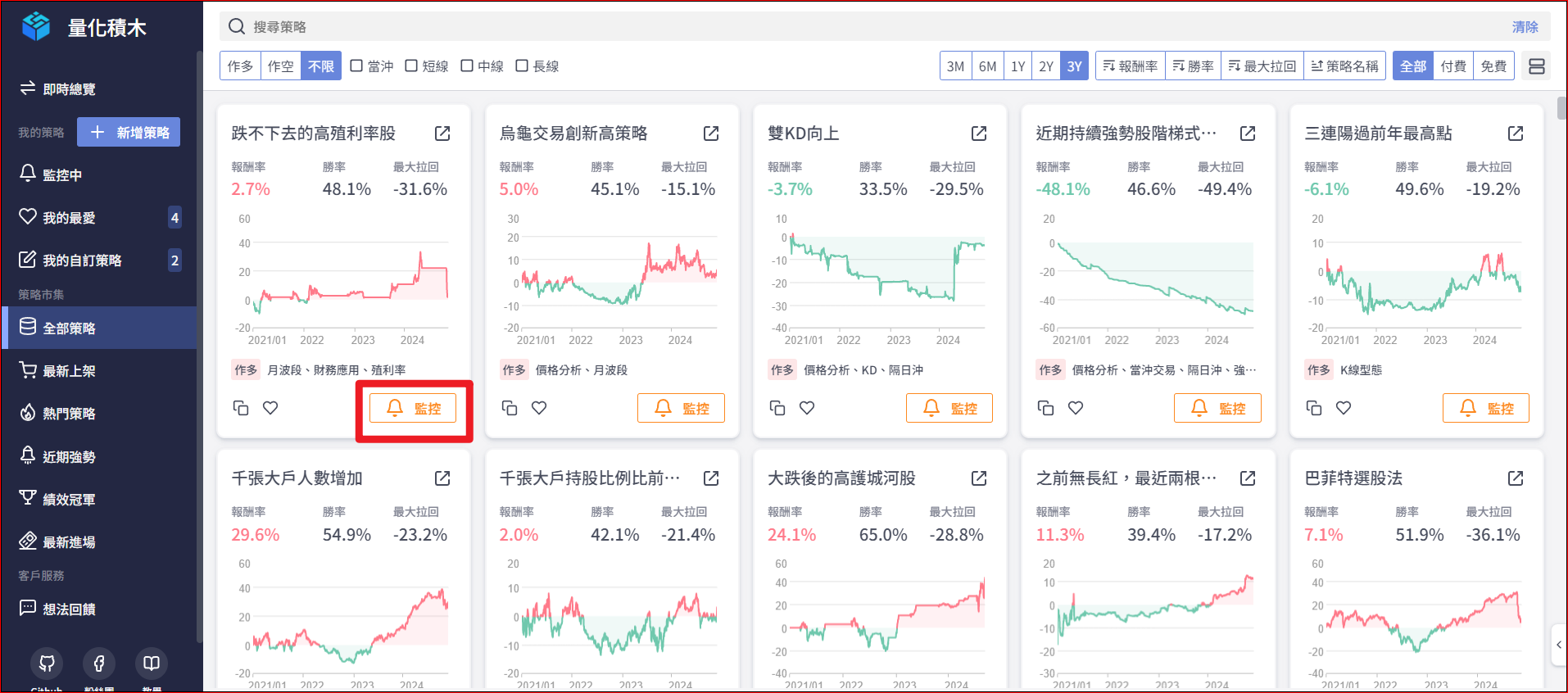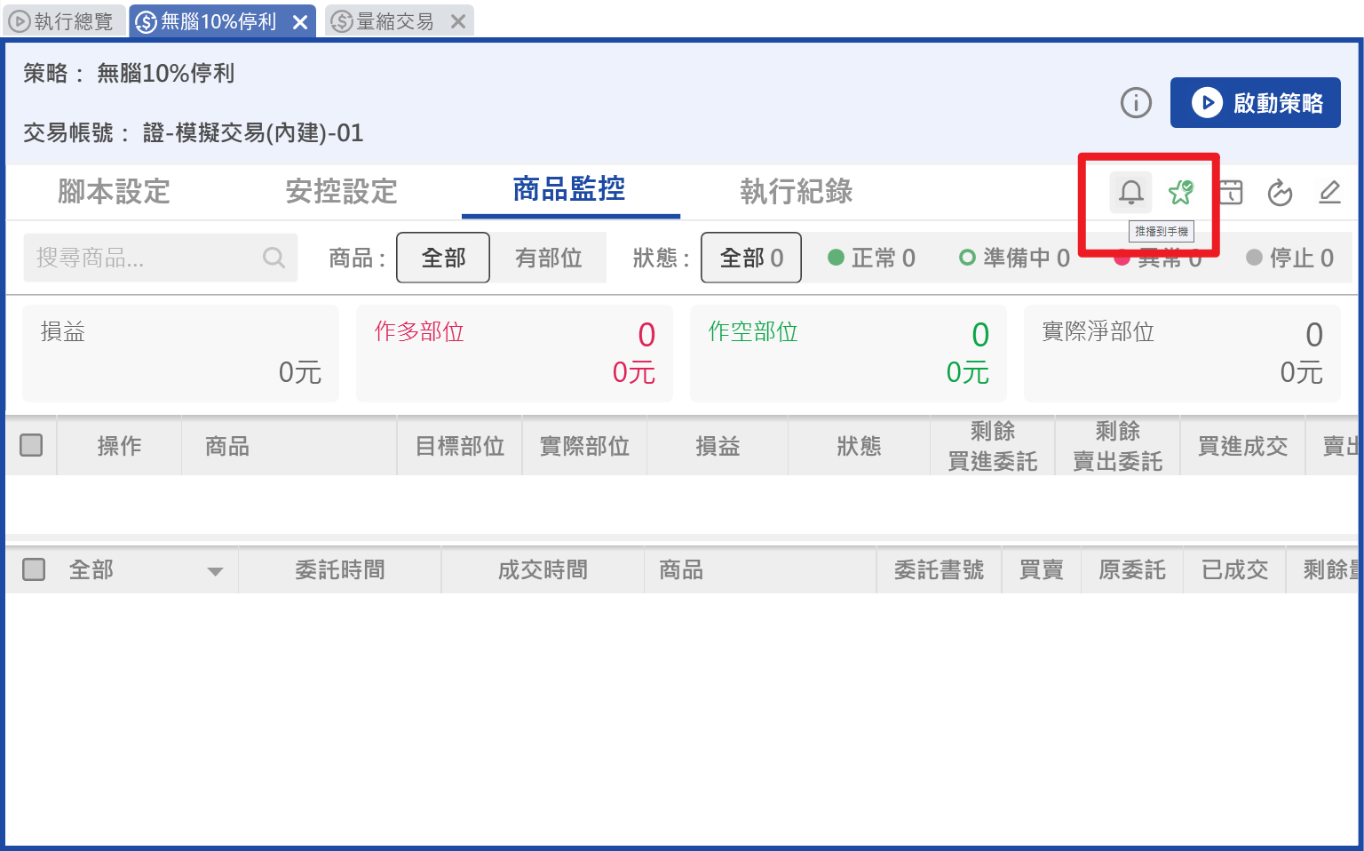量化積木的部份,可以在策略中點擊「監控」這個按鈕,即會將您的策略推送到 APP 端了。▼量化積木監控設定
