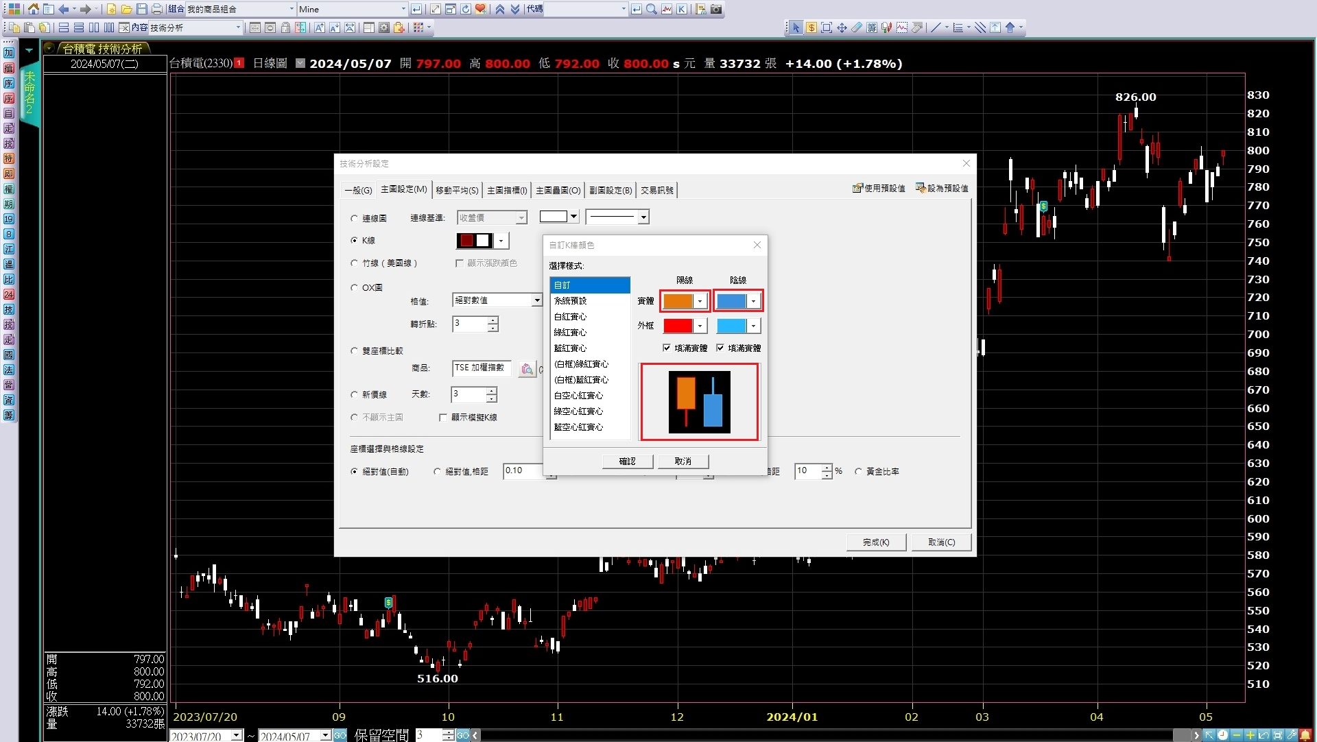 步驟3:點擊K棒顏色的下拉箭頭,系統就會彈出「自訂K棒顏色」設定