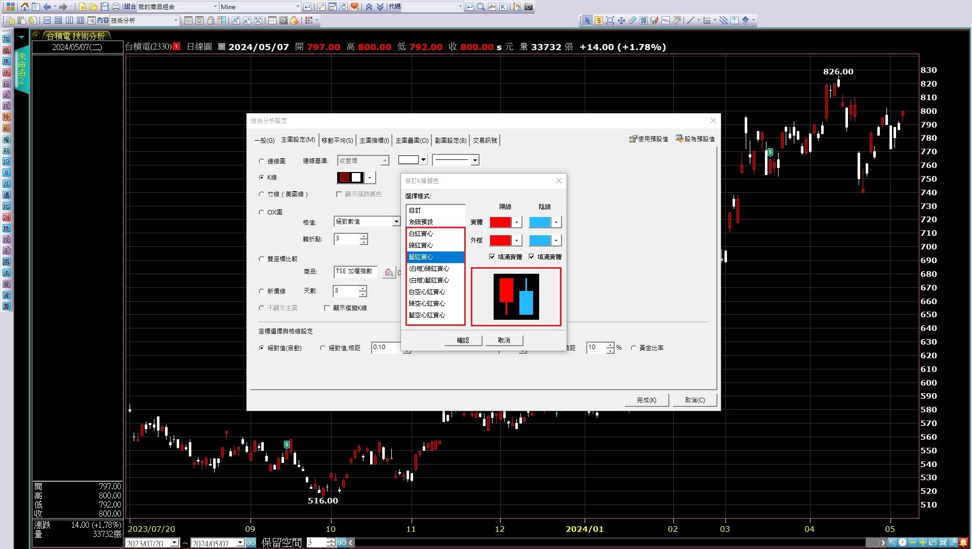 ▼ 可以自訂陽線及陰線的K棒實體顏色
