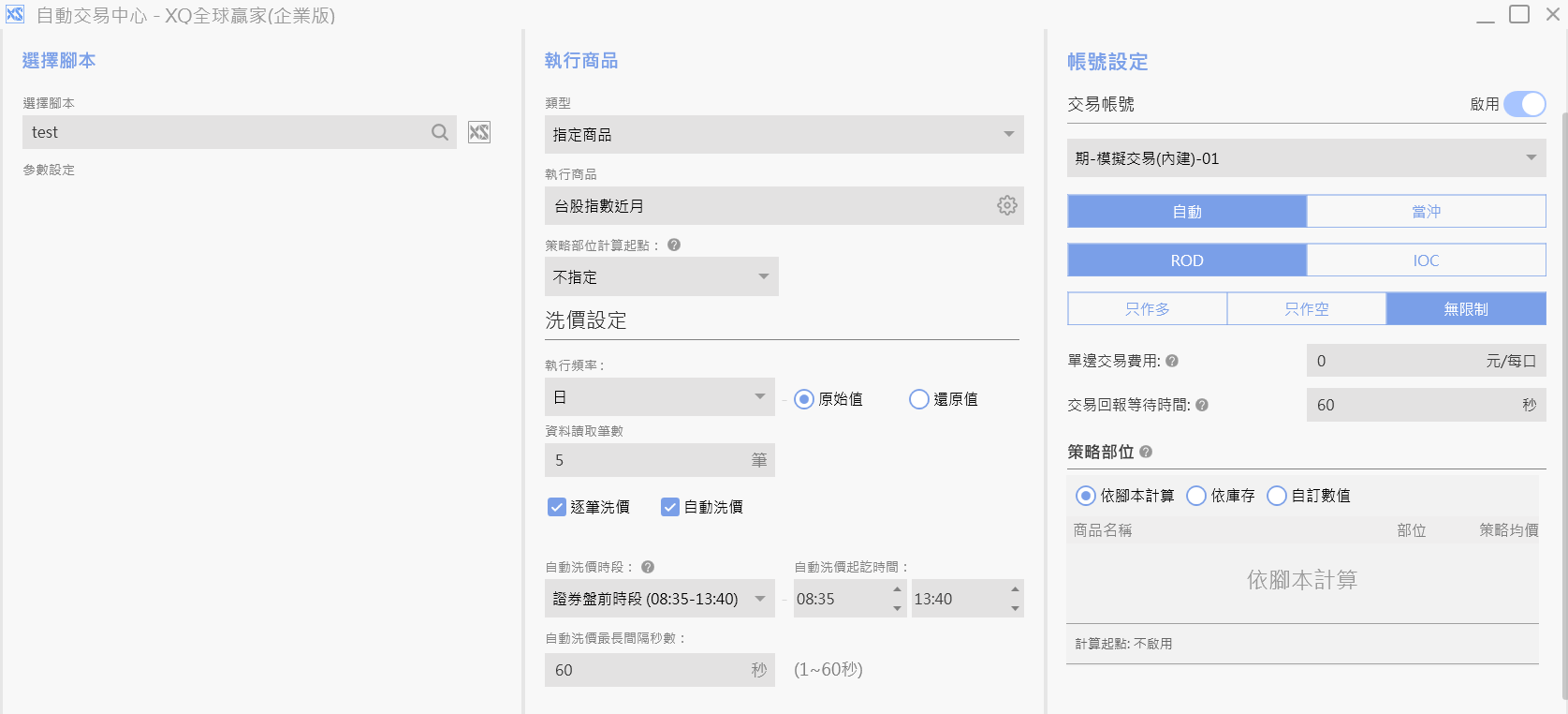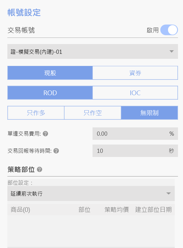 選擇:現股交易/信用交易 選擇現股交易:系統會依照這個帳號的現股庫存數量,以及買賣方向來決定委託單的內容。買進時會送出現股買進,賣出時會送出現股賣出或是現股先賣(當沖)。 選擇信用交易:系統會依照這個帳號的融資/融券庫存數量,以及買賣方向來決定委託單的內容。買進時可能會送出買進融券(回補)或是買進融資委託,賣出時可能會送出賣出融券或是賣出融資的委託。 選擇:ROD/IOC(決定委託單的委託條件) 決定委託單送出的類型是ROD或是IOC。 由於IOC委託會有不成交則被自動取消的限制,所以當系統發現IOC委託被取消時,會自動修正策略的Position數值。 舉例:目前Position = 0,接下來執行了SetPosition(1),策略選擇要用IOC來下單。 當策略執行到SetPosition(1),系統會送出一筆買進1張的IOC委託單,同時下一次洗價時Position會被改成1。 如果這一筆IOC委託成交:下一次洗價時Filled會變成1。 如果這一筆IOC委託沒有成交:由於交易所會自動取消這一筆委託單,所以系統在收到取消通知之後,會自動把Position改成0。會自動調整Position是因為目前已經沒有有效的委託單,所以這個策略的Filled永遠不會變成1,也就會造成Position跟Filled永遠不會同步的情形。 請注意:目前系統尚未支援FOK的委託條件。 單邊的交易成本(%) 系統會依照交易成本的設定來調整執行時所顯示的損益數值。使用者可以依照所選擇券商的交易費用填入對應的交易成本數值。 舉例來說,假設證券手續費折數為 3 折,手續費率為 0.1425 %;交易稅率為 0.3 %,則單邊交易費用約為 0.19 %=((0.1425%*0.3*2)+0.3%)/2 交易回報等待時間 此項設定為當系統送出委託時,等待券商的委託回報時間有多長。若在設定的時間內都沒有收到券商端回覆的委託成功/失敗的回報,系統將會中斷此商品的自動交易運作。 舉例來說,如果將交易回報等待時間設為30秒,且系統在 12:30:00 時產生一筆買進委託送至券商的話,若自動交易中心在 12:30:30 以前都沒有收到券商回報此筆委託成功或是失敗的話,系統將會強制終止該商品的自動交易運作。 4. 交易帳號庫存部位整合
