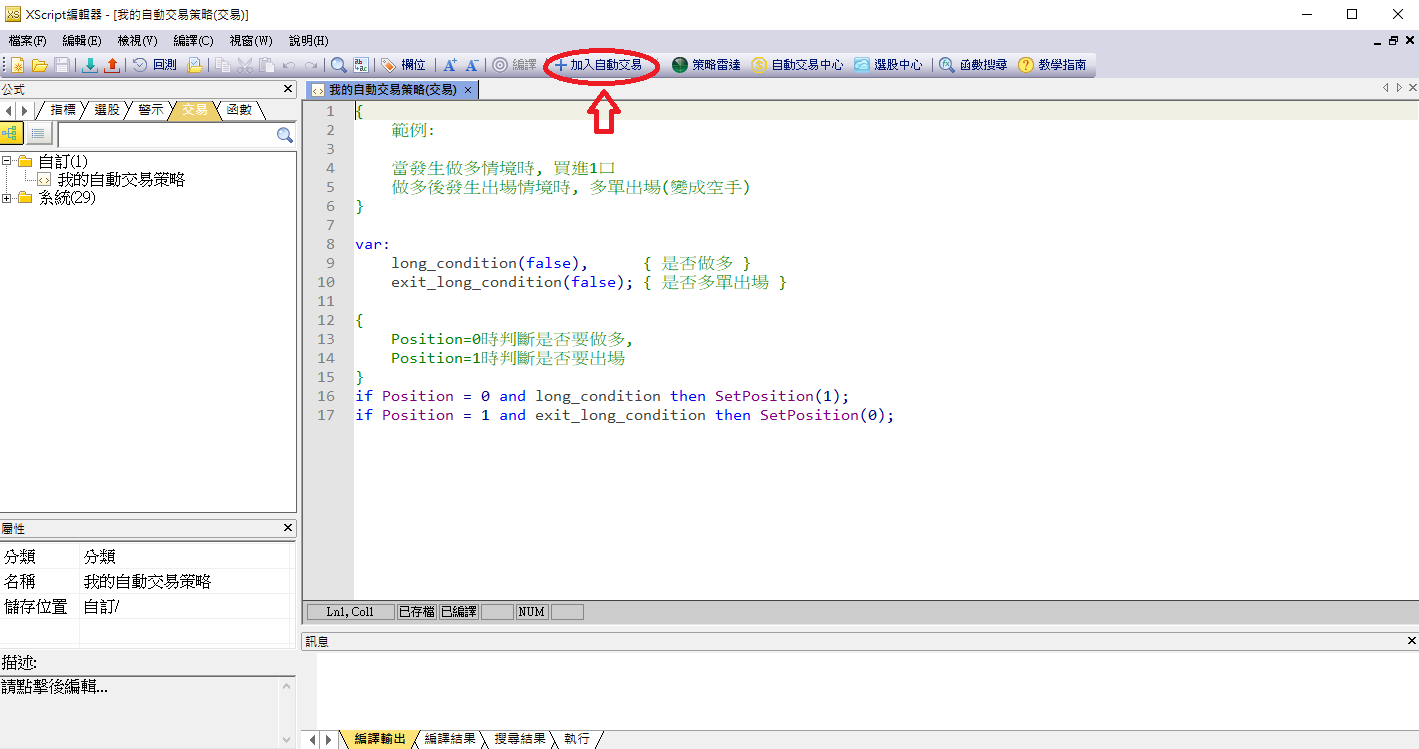 交易腳本編譯完畢之後,我們就可以建立一個「自動交易策略」來執行這個腳本。 建立自動交易策略的方式有兩種。 ▼第一種方式是直接在XS編輯器內,選擇交易腳本,然後按右鍵「加到自動交易」。