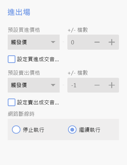 設定策略預設的買進價格以及賣出價格。腳本內的交易指令可以指定委託的價格,此時系統就會依照指定價格送單。如果交易指令內不指定價格的話,則會使用策略的預設買進/賣出價格來傳送委託。 使用者也可以決定萬一行情網路發生連線問題時,策略的執行會自動停止,還是等到行情連線恢復時繼續執行。 ▼策略執行期間如果遇到報價網路斷線的情形時,使用者可以透過策略設定來決定處理的方式