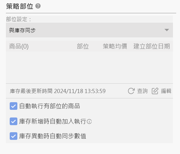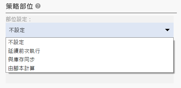 - 「庫存異動時自動同步數值」:勾選時, 如果使用者透過其他交易管道異動執行商品的部位時, 策略會自動同步新的數量。