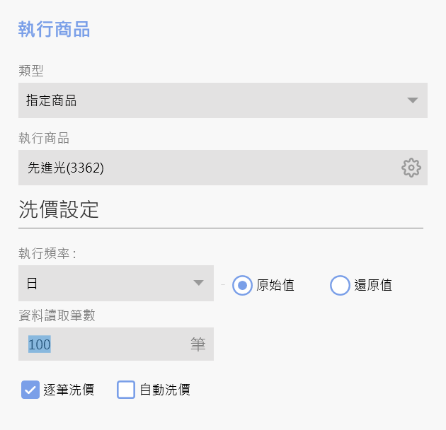 洗價的三種選項,會有 4 種運作方式,說明如下: 逐筆洗價和自動洗價皆不勾選 在這種情況下,策略的運作方式會和原本的非逐筆洗價相同。 只有在執行商品 K 棒結束後的第一次洗價,策略才會去運算已結束的那根 K 棒。 只勾選逐筆洗價 在這種情況下,策略的運作方式會和原本的逐筆洗價相同。 策略會在每次商品洗價時運算,每次運算間隔最短會相隔 0.125 秒。 只勾選自動洗價 在這種情況下,策略會在設定的間隔秒數後自動洗價運算。 不會受到商品本身是否發生成交 Tick,或是 K 棒是否結束而影響。 為了確保每根 K 棒運算結果正常,換 Bar 後的第一次自動洗價會重洗已結束 K 棒,此次洗價不會觸發警示或交易。 逐筆洗價和自動洗價皆勾選 這模式是結合「逐筆洗價」和「自動洗價」的功能。 策略除了在執行商品有新成交 Tick 進來的時候運算 (逐筆洗價規則),若在自動洗價設定的間隔秒數間都沒有 Tick 進來時,策略也會取用最後一次成交的資料自動洗價並運算。 2.3. 資料讀取筆數