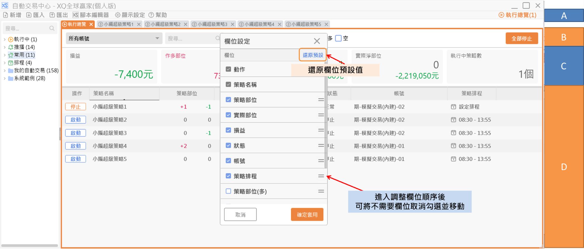 - 目前提供共12個欄位包含:動作、策略名稱、目標部位、實際部位、損益、狀態、帳號、策略排程、目標部位(多)、目標部位(空)、目標部位(多)、目標部位(空),預設值會將「動作及策略名稱」強制開啟,其餘欄位可按照大家的需求來調整順序