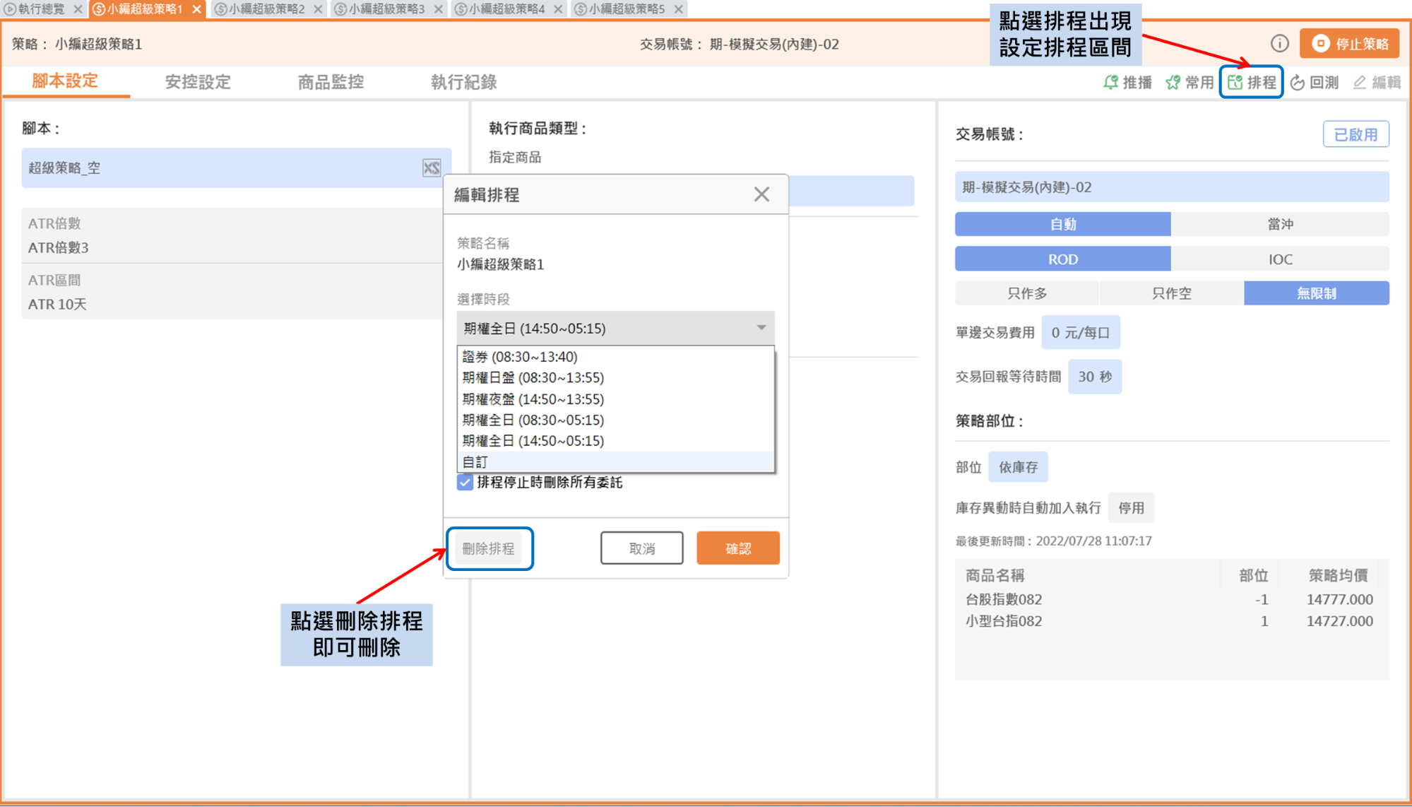 ▼為了讓策略能夠在指定的策略自動啟動與停止,我們可以在每個策略的右上角「排程」中設定策略啟動與停止的區間。若要刪除排程,也是點選「排程」,內有刪除排程的按鈕。