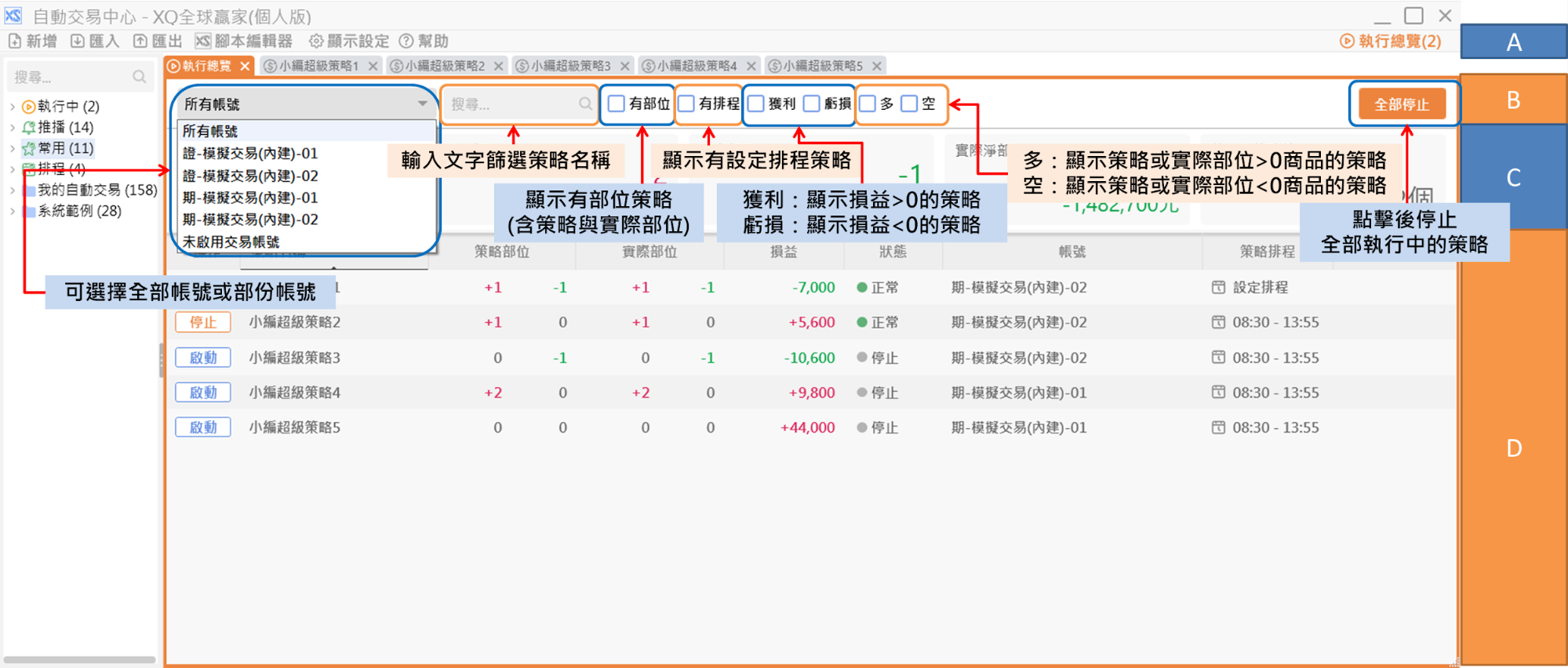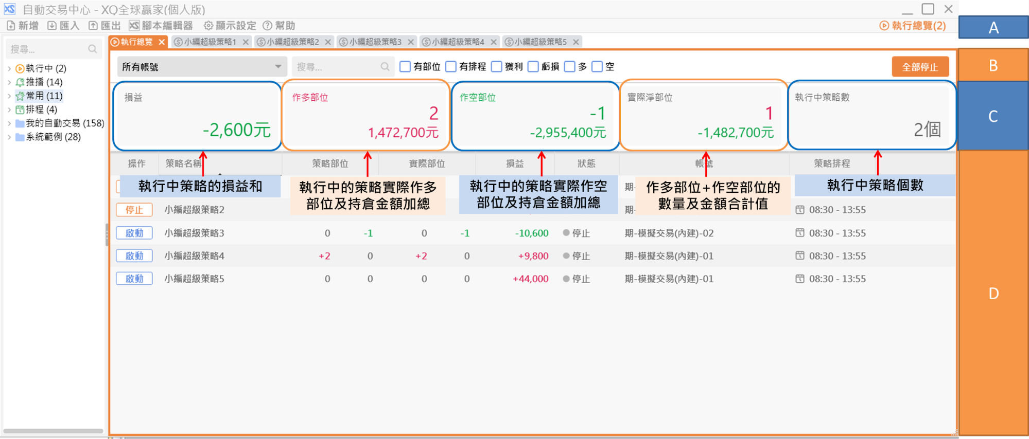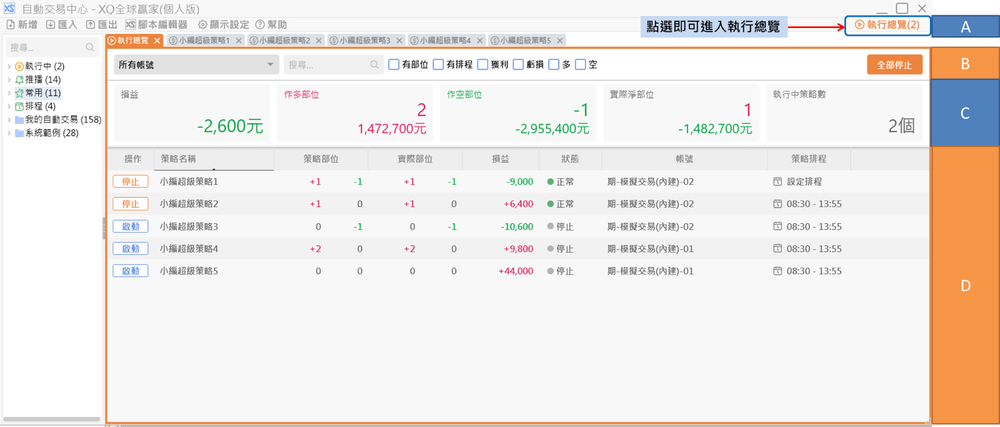 只要策略中有設定「策略排程」或是當日有執行過的,點選「執行總覽」就會看到這些策略,在盤中能更方便掌握策略執行的狀況,我們在下列圖示中分成四區來介紹。3.1 執行總覽按鈕