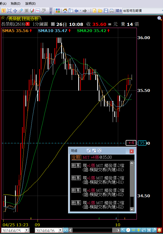 模擬交易帳號-01 與 模擬交易帳號-02 MIT單,現股買進長榮航(2618),總共有 4 張,現股價格 35 元。- 模擬交易帳號-01 MIT 現股買進 1 張,觸發價 -2 檔。