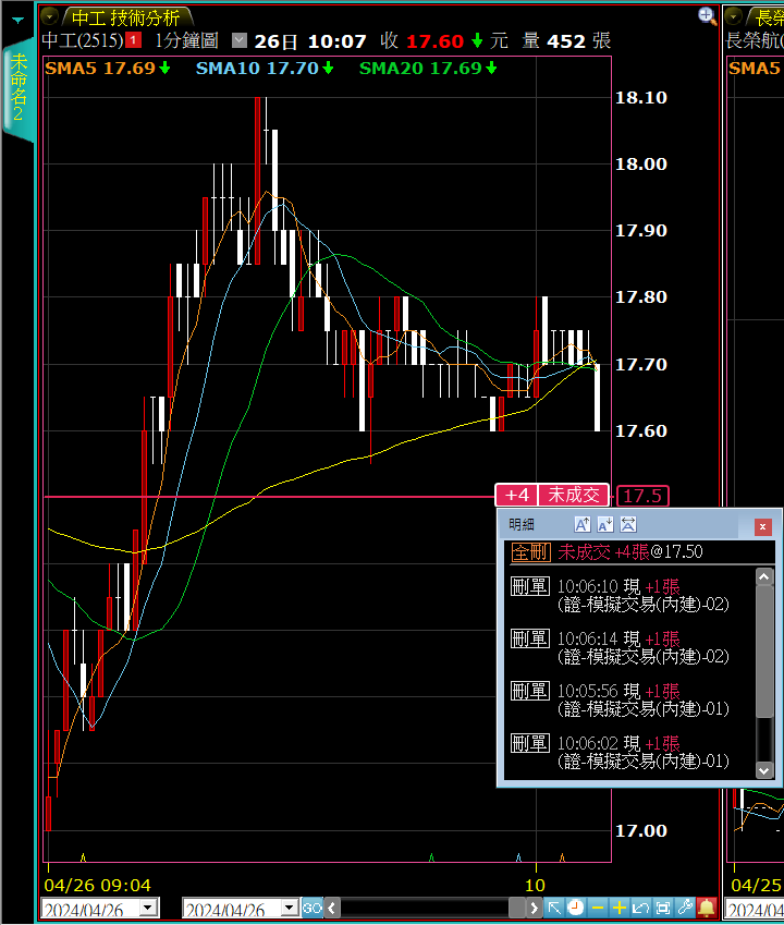 模擬交易帳號-01 與 模擬交易帳號-02 限價單,現股買進中工(2515)總共 4 張,現股價格 17.50 元。- 10:06:10 模擬交易帳號-02 限價單 現股買進 1 張。
