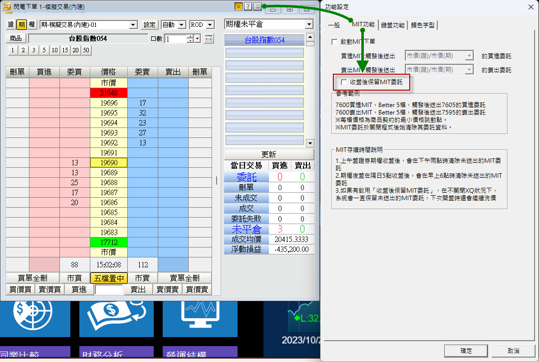 - MIT 標記訊號,則是會依據是否開啟「收盤後保留 MIT 委託」來決定存續時間,可以參考「MIT存續時間說明」如下圖。