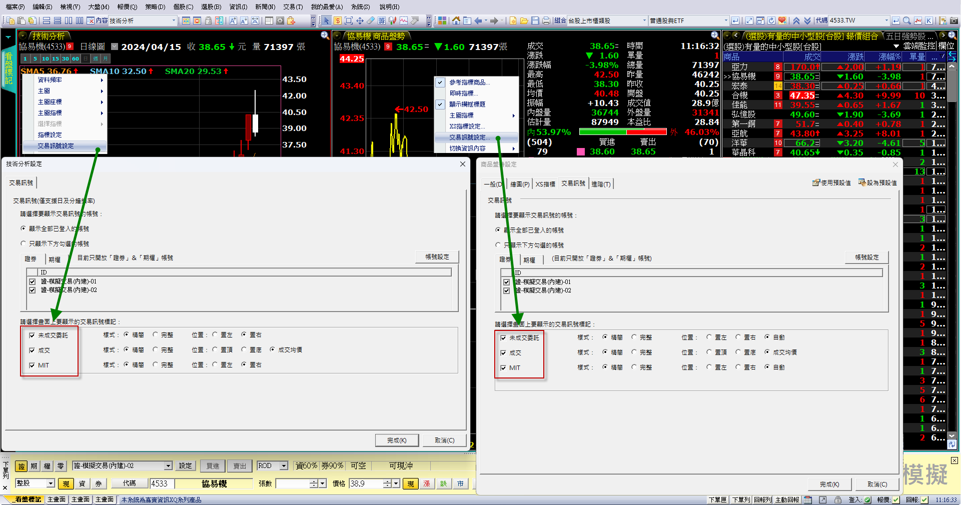 2. 在技術分析與商品盤勢,右鍵選單選擇「交易訊號設定」並開啟「未成交、成交、MIT」交易訊號標記,即完成設定。