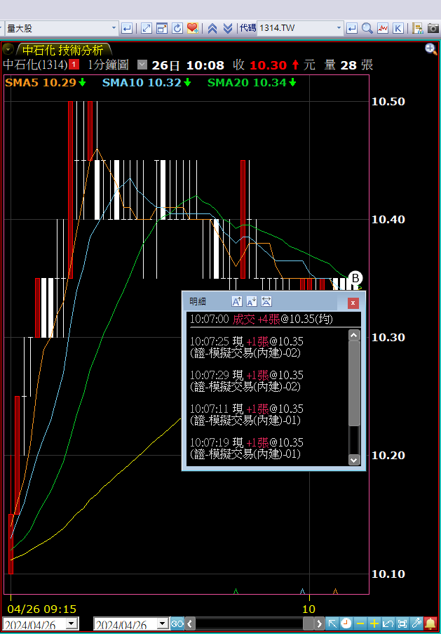 10:07:00 模擬交易帳號-01 與 模擬交易帳號-02,總共買進成交中石化(1314)4 張,成交均價 10.35 元。- 10:07:25 模擬交易帳號-01 現股買進成交 1 張。