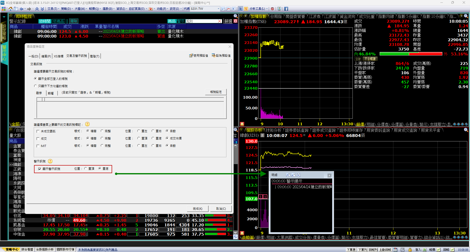 目前在 7.15.01 / 3.15.01 有提供警示訊號標記功能,使用者透過「雲端策略中心、量化積木、雲端監控、一般警示、XS-策略雷達、XS-自動交易、權證-權證策略」這些功能觸發的警示訊號,都可以透過此功能,將警示訊號標記顯示在商品盤勢與技術分析頁面上,警示訊號標記會在下一個交易日的商品清盤時間清除, 那麼如何將警示訊號標記設定顯示在商品盤勢與技術分析頁面上呢? 答案是在商品盤勢與技術分析頁面上,按下滑鼠右鍵,並點擊「設定」按鈕,然後到「交易與警示訊號標記」的標籤頁面,將「警示訊號標記」功能選項打勾,按下完成後,就會在商品盤勢與技術分析頁面上出現警示訊號標記。