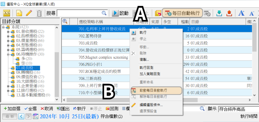 好的,那接下來我們和大家分享如何打開每日自動執行,這個操作非常簡單,依照下圖 A 或是 B 的方法- 選中策略,點擊上面的「每日自動執行」鍵