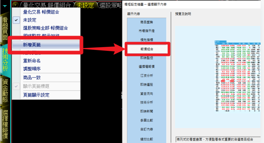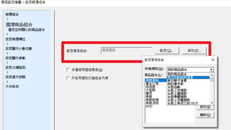 點擊下一步之後,在設定商品組合中點「設定」,選「每日自動選股清單」,在「選股策略全部」上點確認鍵,接著可以直接按完成。▼設定報價組合