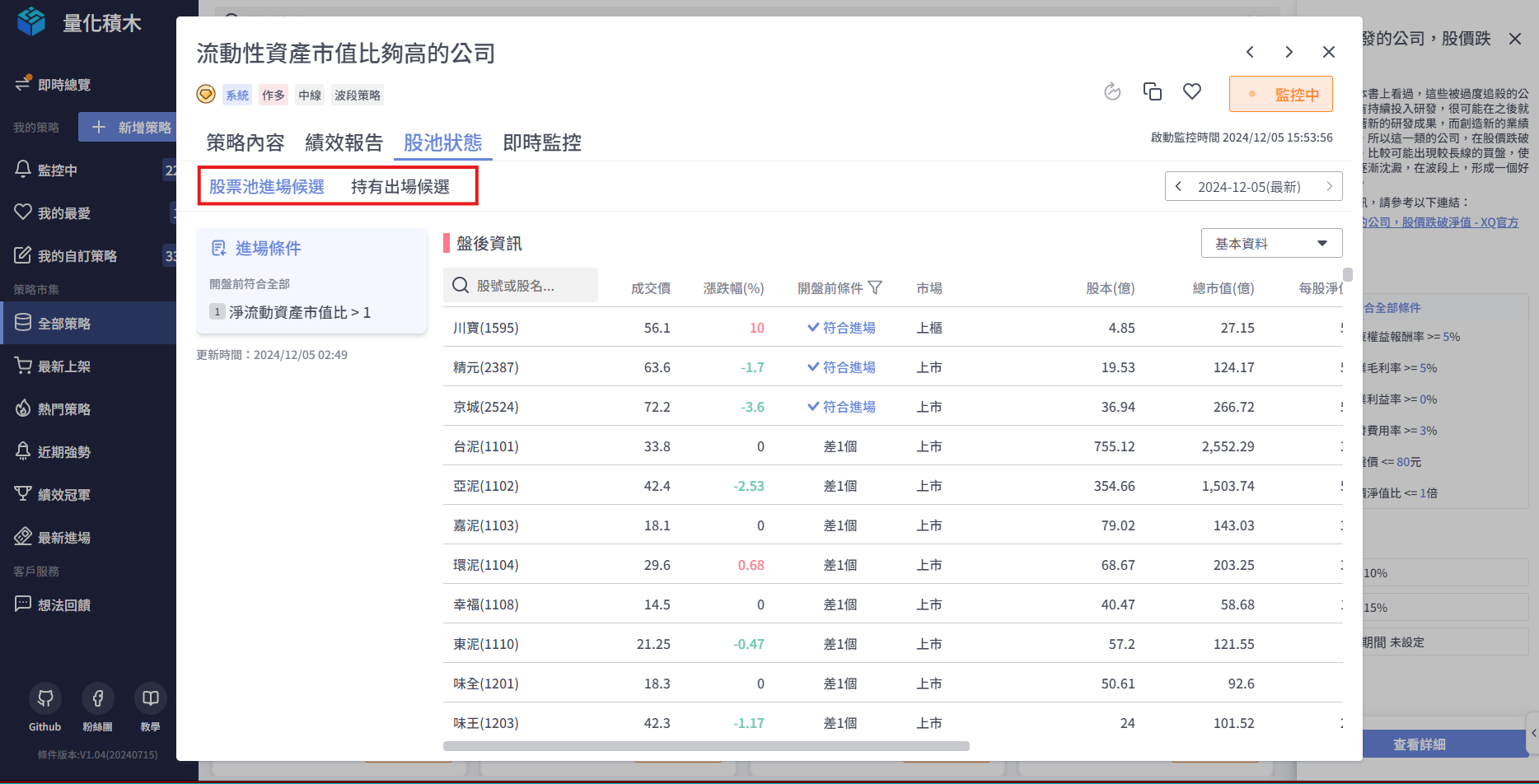 顯示符合策略設定條件的進場標的,並會扣除當前策略已持有的標的。3.1. 情境1-策略設定:只有開盤前條件(盤後條件)
