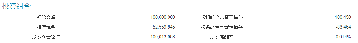 初始金額:證券+期貨帳戶初始資金 = 5千萬+5千萬 = 1億元 持有現金:證券+期貨帳戶帳戶現金 投資組合總值:初始金額+股票(已實、未實)+期權(已實、未實)帳戶所合計之價值 投資組合未實現損益:股票+期貨權帳戶目前部位以市價計算的未實現損益加總 投資組合已實現損益:股票+期權帳戶已實現損益加總 投資報酬率:(投資組合總值-初始金額) / 初始金額