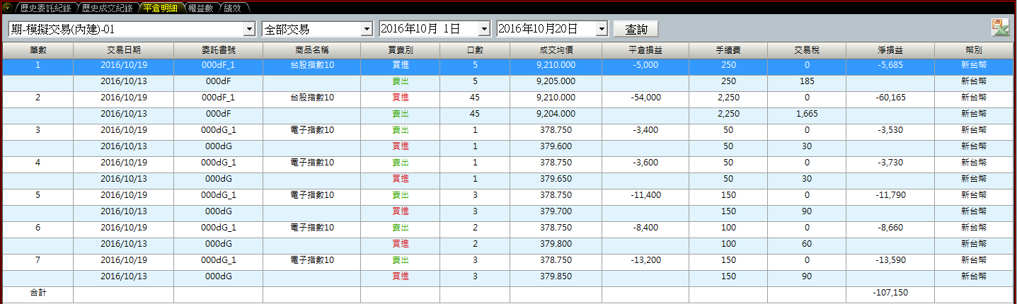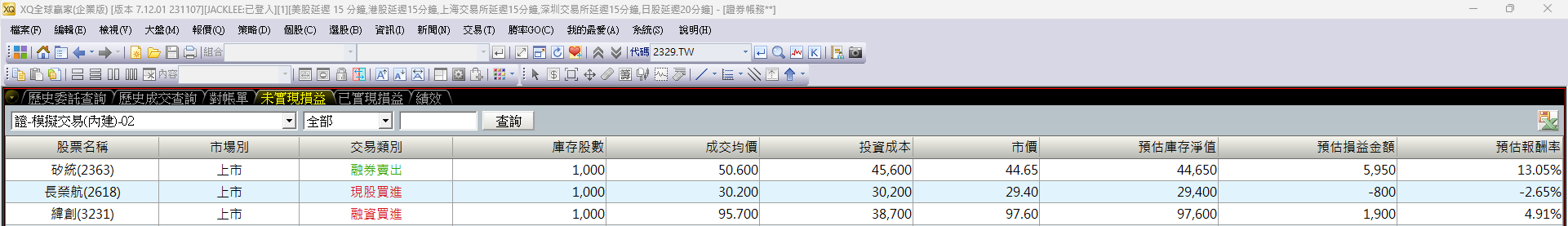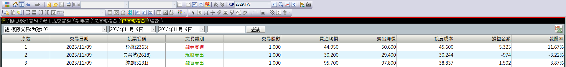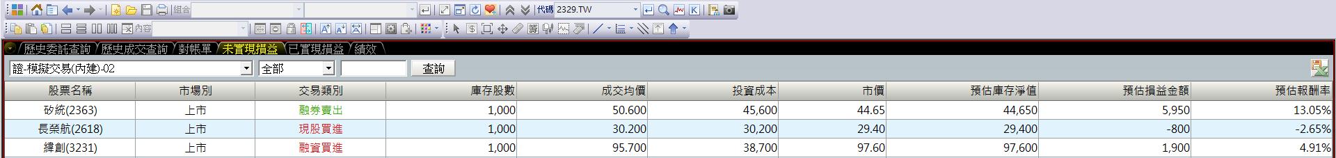 | 矽統(2363) | 融券賣出 | 5,950 | -1×(50.60-44.65)×1,000 | 50.60 | 44.65 | 1,000 | -1 |