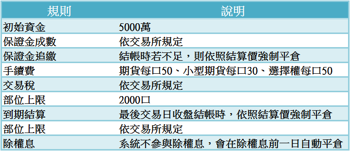 - 手續費:期貨每口50、小型期貨每口30、選擇權每口50。
