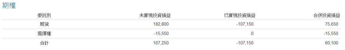 未實現投資損益:期權未平倉頁面 – 損益加總 已實現投資損益:平倉明細頁面 –淨損益加總 合併投資損益:未實現投資損益 + 已實現投資損益