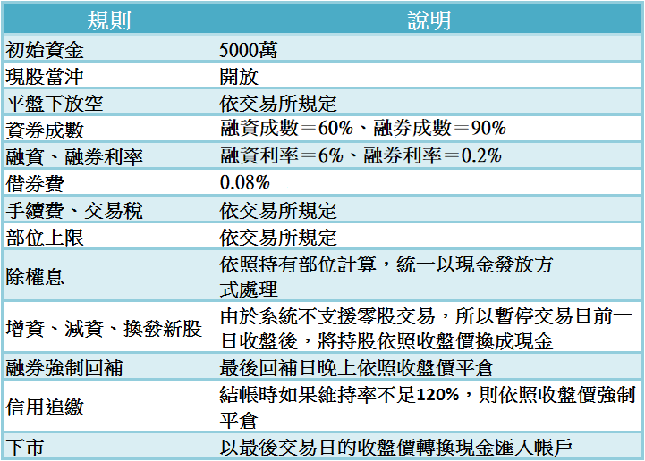 - 融資成數在內建模擬交易的設定「上市股票是 60 %、上櫃股票是 50 %」