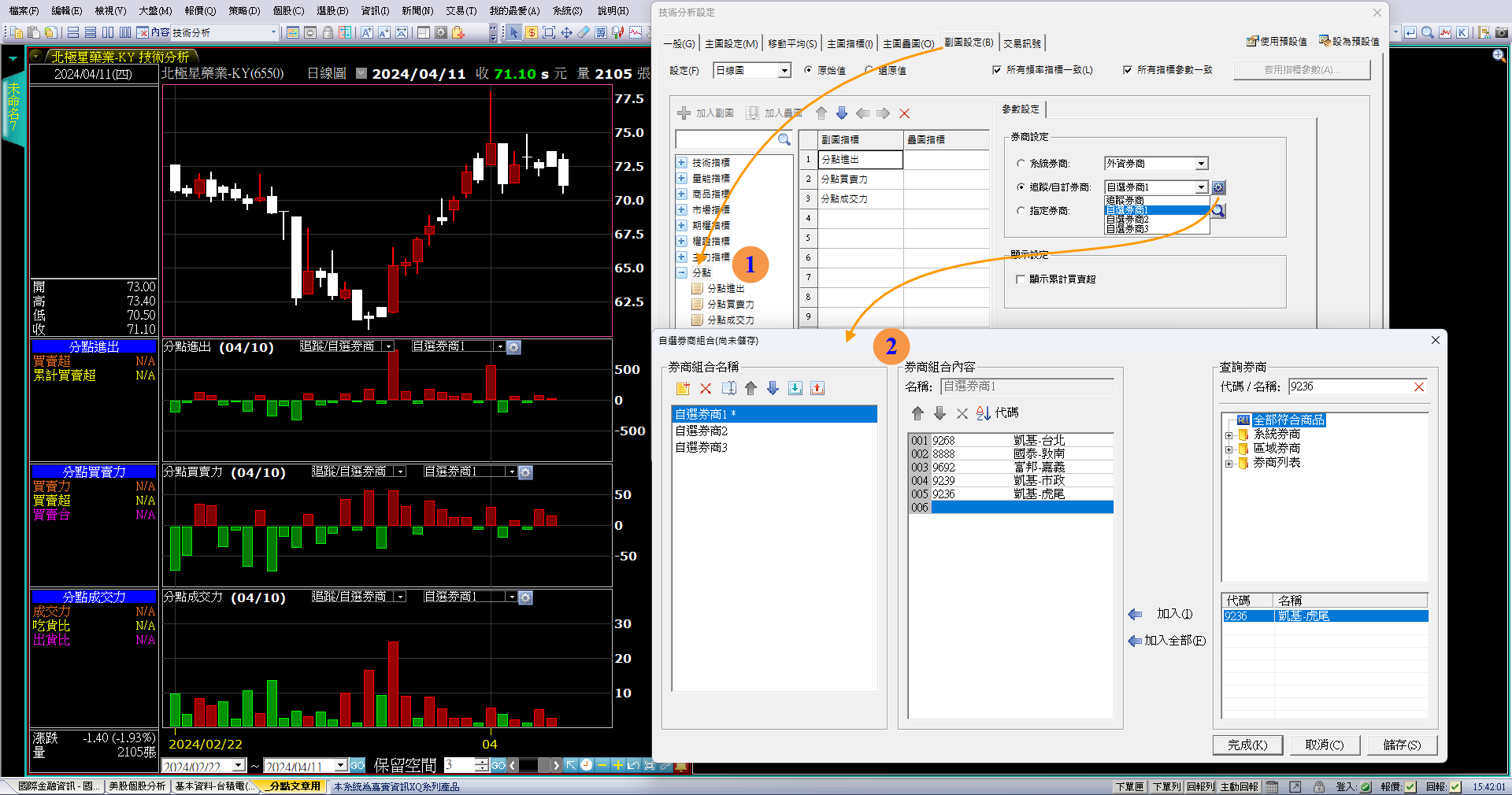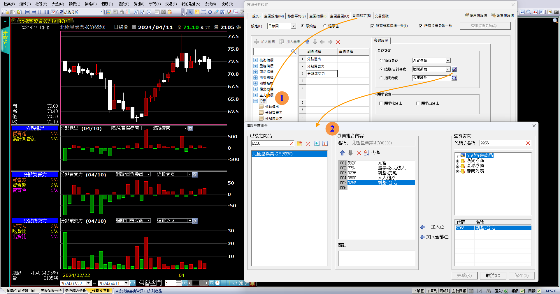 1. 在技術分析指標設定,加入分點指標(分點進出/買賣力/成交力)