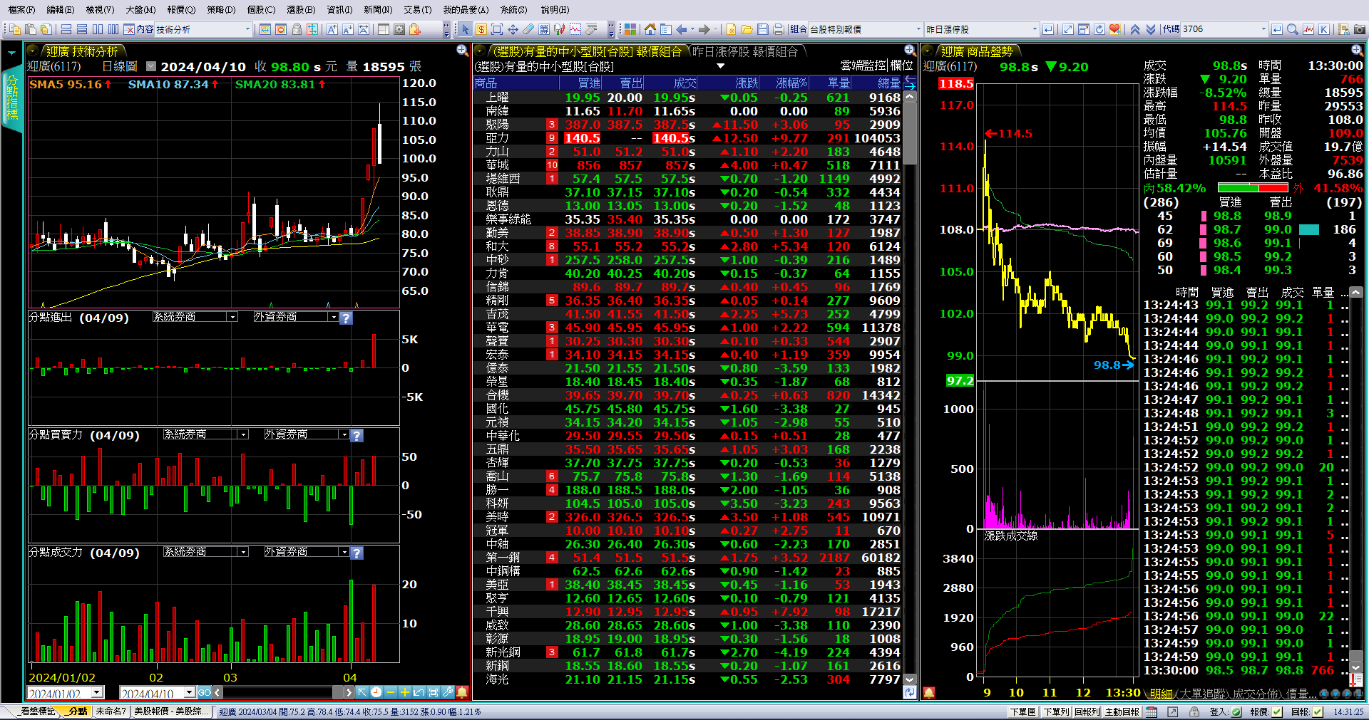XQ 已將 個股進階籌碼 中的分點指標,整合到技術分析的「分點」副圖指標。此次新增的「分點進出、分點買賣力、分點成交力」三個指標,必須要購買「籌碼分析模組」才能使用。 分點指標整合到技術分析頁面後,即可方便檢視股票名單上的分點指標數據,例如以下這張圖,是新增一個頁面,切成三個欄框,放上技術分析的分點指標、報價組合、商品盤勢,並用同步功能,就能快速切換商品,掌握各檔股票的分點指標數據狀況。 接下來,將依序舉例說明分點指標搭配「系統券商、指定券商、追蹤/自選券商」的使用介紹,首先我們先從「系統券商」開始。 以下是本篇文章的目錄:   一、分點指標搭配「系統券商」 二、分點指標搭配「指定券商」 三、分點指標搭配「追蹤/自選券商」