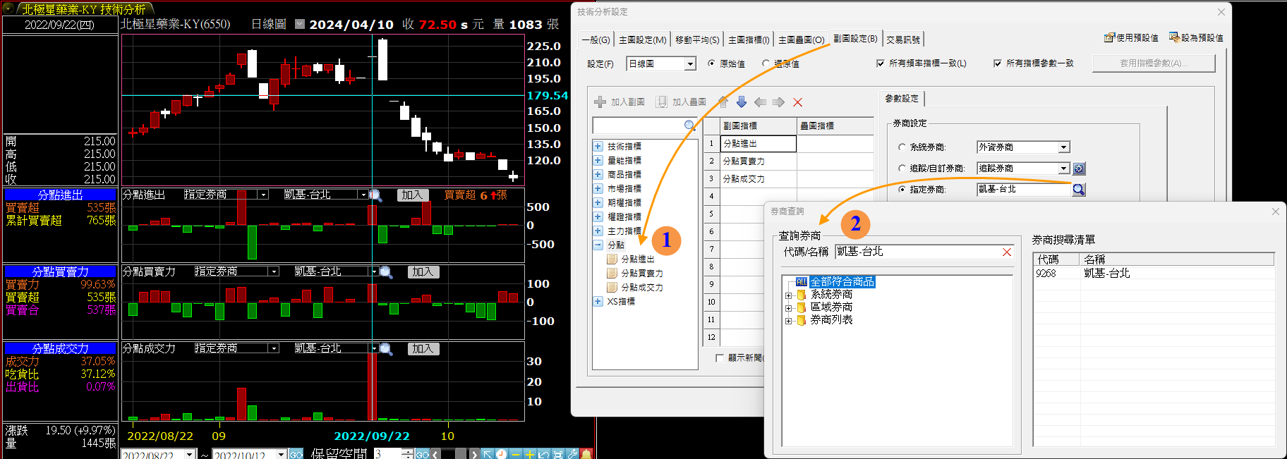 若想觀察特定單一分點券商,對股票的籌碼面影響力為何?則可用分點指標搭配指定券商來觀察。 舉例來說,觀察北極星(6550.TW)在 2022 年 09 月 22 日「凱基-台北」券商分點的表現,我們可以依照以下兩點操作,加入副圖指標觀察: