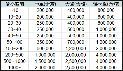 系統依照商品當日的開盤價決定價格區間,然後把每一筆成交金額依照以下表格來做小單,中單,大單,以及特大單的標記。舉例而言,如果某檔商品今天的開盤價是15.0元的話,那麼如果某一筆成交金額小於20萬的話,這一筆就是小單;如果是介於20萬到40萬之間的話,則這一筆算是中單;如果是介於40萬到80萬之間的話,那這一筆算是大單;超過80萬的話則算是特大單。 要特別注意的是,如果這一筆成交不是逐筆撮合所產生的,例如每一日開盤的第一筆成交,收盤的那一筆成交,或是因為異常原因進入處置撮合時的成交,都不會列入統計。 我們會定時檢視市場成交的統計資料分佈情形來決定是否需要調整這個級距表,如果有任何異動的話會隨時公告給大家知道。