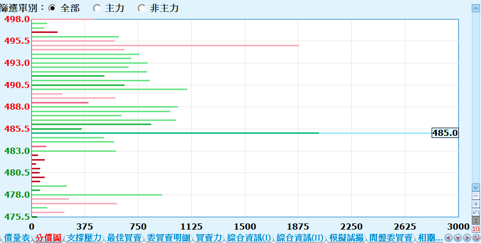 • 加上篩選單別功能。可以查看全部價量或是主力單(包括大單與特大單)或非主力單(是指小單與中單)。