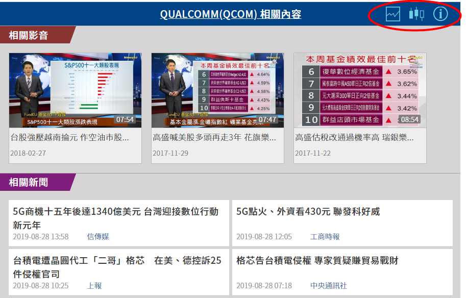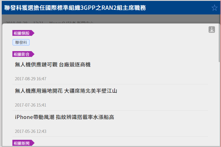 (圖一)  (圖二)   點選向上按鈕,可以查看更多相關議題的文字新聞或是影音新聞。 (圖三)   點擊透過解析出來的相關個股標籤,可查看更多的相關文字與影音相聞,也可直接去看報價,線型,財務數據等相關內容。 (圖四)
