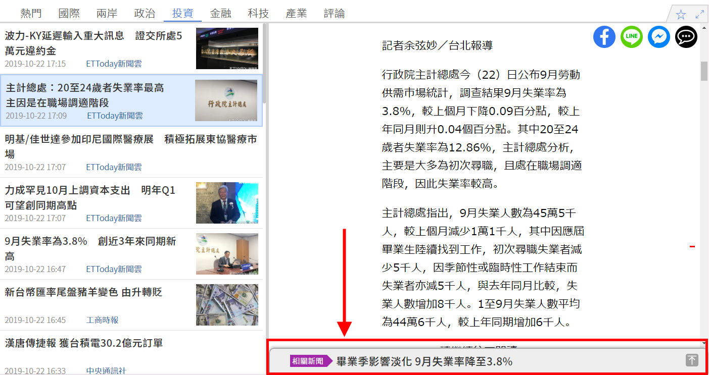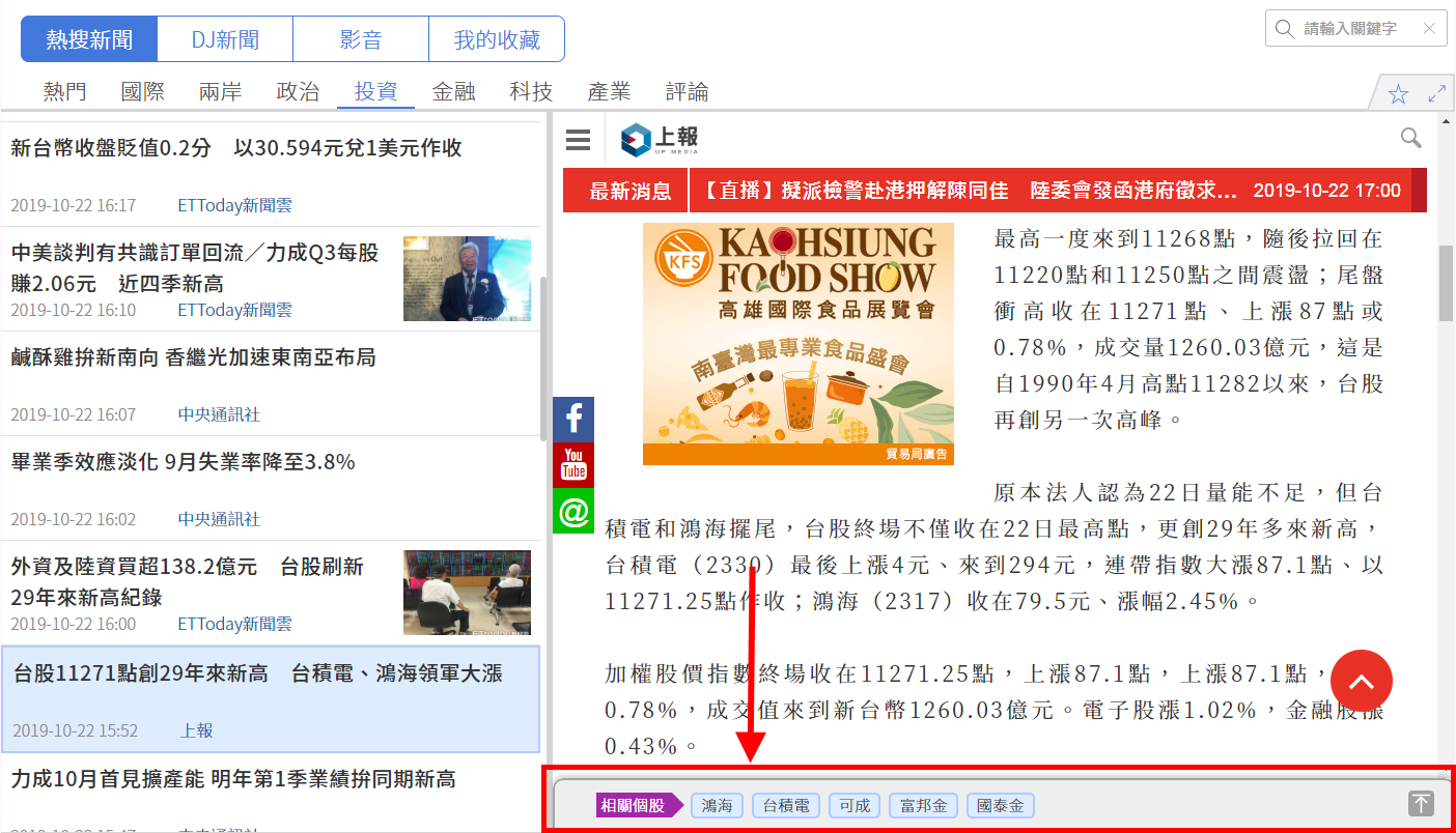 在《熱搜新聞》與《DJ新聞》的每則新聞下方可看到新聞提及的相關個股或是相關議題的文章,