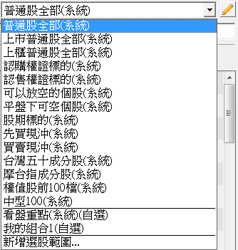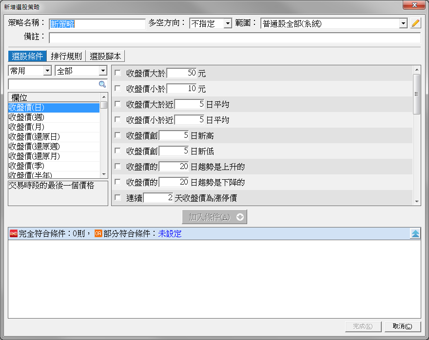 右上角的選股範圍可以從系統提供的幾個範圍以及自選組合中挑選。若是不足使用,可以點擊 filter23,自訂新的選股範圍。不過一般的狀況下,我們會直接設定成普通股全部(系統)filter22設定完基本資料後,我們就可以開始來設定選股法的內容。 這邊有三類條件可以選擇:選股條件、排行規則及選股腳本。