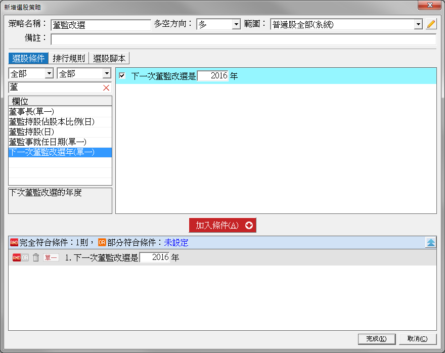 首先我們來看選股條件。 選股條件是以欄位為基礎。點選欄位後,畫面右邊會列出欄位相關的選股條件。 怎麼找出要使用的欄位呢?如果你熟悉股票、財報相關名詞的話,最快的是利用搜尋來找欄位。不然的話也可以利用分類選單來查找。 那麼我們現在來加入董監改選的條件: 1. 在搜尋框中輸入「董」,欄位的部份就會篩選出包含這個字的欄位有哪些。 2. 選擇「下一次董監改選年(單一)」,右邊就會出現可選的條件。欄位的名稱後面的括弧是代表頻率,你可以同時使用不同頻率的資料來組成選股策略。 3. 條件中的輸入框代表是可以調整的參數。我們把參數改成2016,也就代表這個條件是找「下一次董監改選是2016年」的股票。 4. 點擊加入條件(A),把設定好的條件加入已選條件區。   filter24
